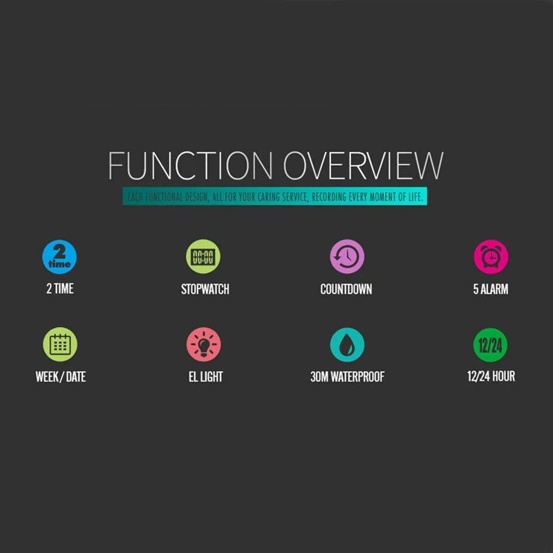 - Function: 2 time, stopwatch timing, luminous, day, date, alarm clock, 12/24 hour system, countdown